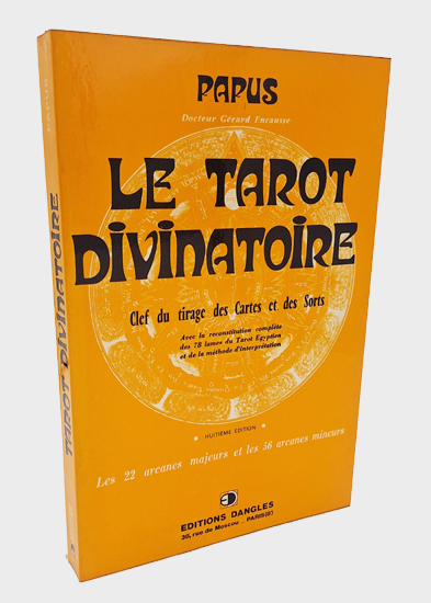 Papus (Ps.) = Docteur Gérard (Analect Vincent) Encausse: Le Tarot Divinatoire. Clef du tirage des Cartes et des Sorts. Éditions Dangles, Paris 1973. Huitiéme Édition. Gr.-8°. Avec la reconstitution complète des 78 lames du Tarot Egyptien et de la méthode d’interprétation. 2 Bl., 188 S., 79 Bl. Karton original illustré.