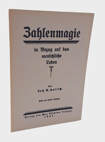 Hulisch, Joh. A.: Zahlenmagie in Bezug auf das menschliche Leben. Verlag von Max Altmann, Leipzig 1924. Erste und zweite Auflage. Kl.-8°. Mit 7 Figuren und div. Tabellen. 40 S., 2 Bl. Vlgs.-Anz. OKarton.