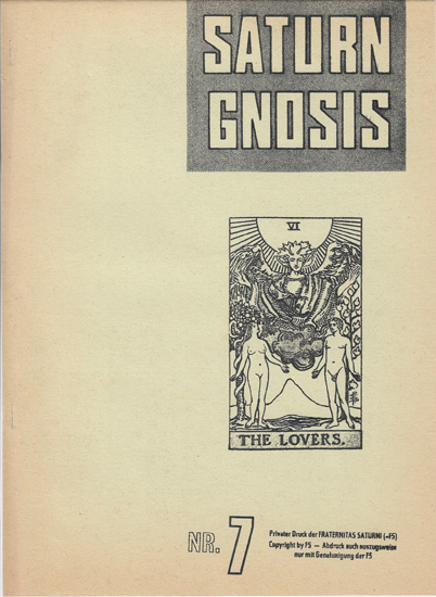 Saturn Gnosis. Nr. 7. Privater Druck der Fraternitas Saturni, o.O. u. o.J. [Frankfurt am Main / Neu Isenburg, ca. 1971]. 4°. 21 S., 3 Bl. (Abbildungen auf Karton). Loseblattwerk.