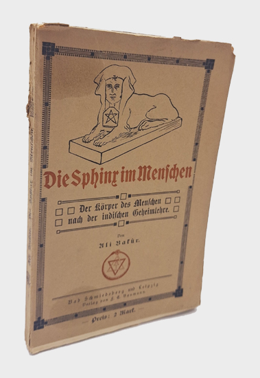 Bakûr, Ali (Ps.) = Johann Baptist Wiedenmann: Der Mensch nach der indischen Geheimlehre. Die Sphinx im Menschen. Das Rätsel des Aetherkörpers oder Lebensleibes. Verlag von F[riedrich] E[duard] Baumann, Schmiedeberg (Bez. Halle) und Leipzig o.J. [1915]. Mit 1 farbigen Tafel (Ätherkörper). VI, [2], 119, (1) S. OBroschur.
