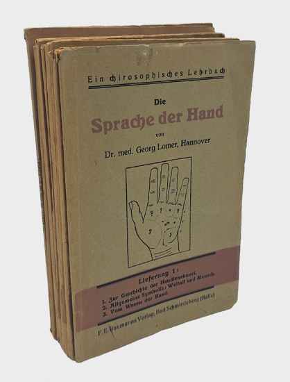 Lomer, Dr. med. Georg [Heinrich]: Ein chirosophisches Lehrbuch. Die Sprache der Hand. Lieferung 1-7 (in 7 Bdn.). Verlag von F[riedrich] E[duard] Baumann, Bad Schmiedeberg (Halle) o.J. [ca. 1920]. 3 Bl., 331, 3 S. Vlgs.-Anz., 1 (w). Illustr. OKarton Bände.
