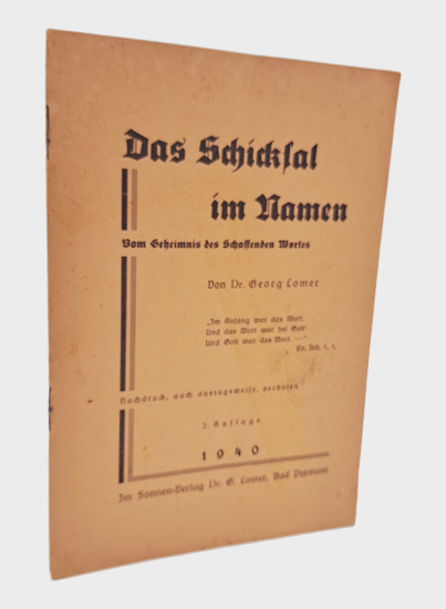 Das Schicksal im Namen. Vom Geheimnis des Schaffenden Wortes. Im Sonnen-Verlag Dr. G. Lomer, Bad Pyrmont 1940. 2. Auflage. 14 S., 1 Bl. OKarton.