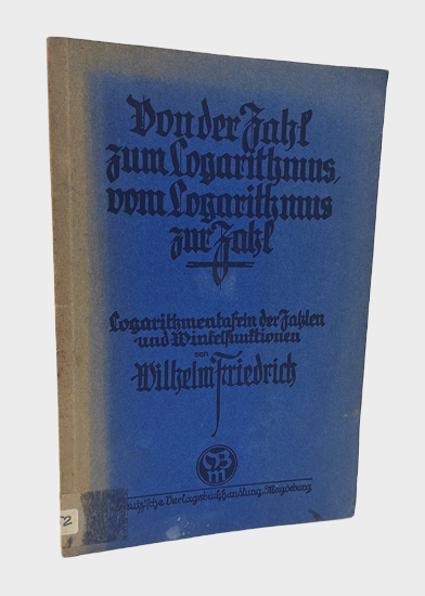 Friedrich, Wilhelm: Von der Zahl zum Logarithmus, vom Logarithmus zur Zahl. Logarithmentafeln der Zahlen und Winkelfunktionen. Creutz’sche Verlagsbuchhandlung, Magdeburg o.J. [um 1930]. 48 S. OKarton.