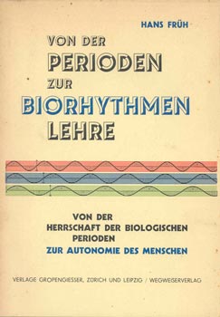 Früh, Hans: Von der Perioden- zur Biorhythmenlehre. Von der Herrschaft der biologischen Perioden zur Autonomie des Menschen. Zürich u. Lpz., Gropengiesser / Wegweiservlg. [1942]. Mit 1 farb. Taf., 1 gef. Taf. als lose Beilage u. Textabb. 143 S. OKart.