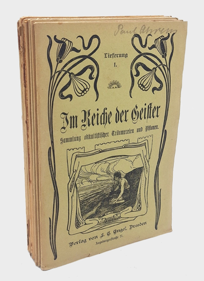 Im Reiche der Geister. Sammlung okkultistischer Träumereien und Visionen. (2 Bde. in 10 Lieferungen, bzw. 10 Heften). L. E. Engel, Dresden u. F. E. Baumann, Bad Schmiedeberg [1904-1909]. 288 S. (Lieferung 1-6), 48, 49, S. 49-144 (Lieferung 7-10). Illustr. OBroschuren im Jugenstil.
