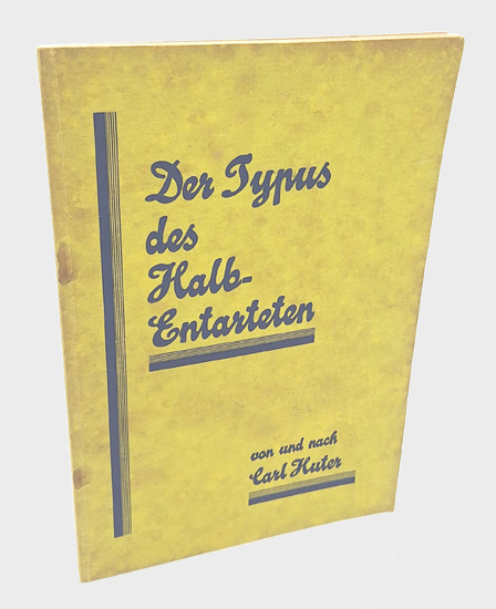 Der Typus des Halbentarteten. Der doppel-naturige oder Intriganten-Typus (Der Wolf im Schafspelz) von und nach Carl Huter. Verlag der Original Huterwerke, Schwaig b. Nürnberg 1930. Gr.8°. Mit einigen Textabbildungen. 40 S. OKarton.