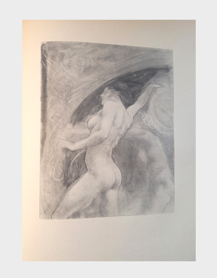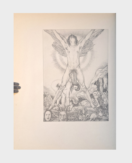 The Focus of Life: The Mutterings of Aaos: written and illustrated by Austin Osman Spare. Printed and Published by The Morland Press Ltd., London 1921. 4° (322 x 262 mm]. Edited by Frederick Carter with an introduction by Francis Marsden. xii, 44 S. (plus 11 plates). Privately bound in brown linen with a gold-embossed leather spine label.