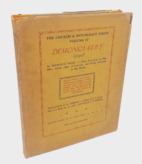 Remy, Nicolas. Demonolatry […] in Three Books. John Rodker, London 1930. 4° [263 x 205 mm]. Translated by E. A. Ashwin. Edited and with an Introduction and Notes by Montague Summers. xliii, [1] w., 188 S. Saffron-coloured cloth spine with light beige cloth boards and the original Dust jacket.
