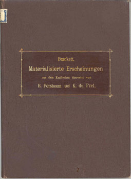 Brackett, E. A.: Materialisierte Erscheinungen: Wenn sie nicht Wesen aus einer anderen Welt sind, was sind sie sonst ? Druck R. Oldenbourg / München 1889. Aus dem Englischen ins Deutsche übersetzt von Bernhard Forsboom und Karl du Prel. VIII Bl. Vorrede, 3 Bl. 115 S., OLwd.