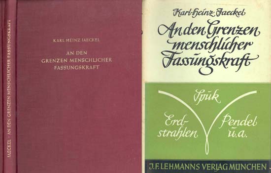 Jaeckel, Karl-Heinz: An den Grenzen menschlicher Fassungskraft. Erdstrahlen – Pendel – Spuk. Unter Mitarbeit von Dr. Franz Wentzel und mit einem Vorwort von Dr. Joseph Wüst. Mchn., J. F. Lehmanns Vlg. 1955. 224 S. OLwd. mit OUmschl.