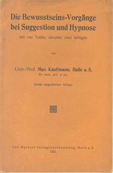 Kauffmann, Prof. Dr. Max: Die Bewusstseins-Vorgänge bei Suggestion und Hypnose. Halle a. S., Carl Marhold Verlagsbuchhandlung 1922. 2. umgearbeitete Auflage. Mit 4 Taf., darunter 2 [doppelblattgroßen] farbigen. 38 S. OBrosch.