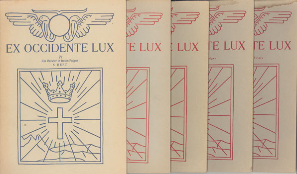Ex Occidente Lux. Ein Ketzerbrevier in freien Folgen. 5 Hefte (= alles erschienene). Heft 1-3: Genossenschaft Psychosophia, heft 4-5: Psychosophische Gesellschaft 1953-1958. Mit Abbildungen. 20 S.; 24 S.; 28 S., 4 Bl.; 39 S.; 18 S. illustr. OKart. Bde.