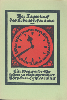 Der Tageslauf des Lebensreformers. Was jeder von der deutschen Lebenserneuerungs-Bewegung wissen muß. Ein praktischer Wegweiser zu naturgemäßer Körper- und Geisteskultur. Johannes Baum Verlag, Pfullingen in Württ. o.J. (um 1921). 3. vermehrte Auflage, 100.-230 Tausend. Mit einem Geleitwort von Hans Gregor. 48 S., 15 S. (Werbung) illustr. OKarton.