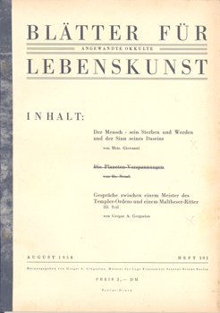 Gregor A. Gregorius (Hrsg.) d.i.: Otto Max Eugen Grosche: Blätter für angewandte okkulte Lebenskunst. August 1958 (Heft 101). Herausgegeben (als Privatdruck) von Gregor A. Gregorius. Meister der Loge Fraternitas Saturni Orient Berlin, Berlin 1958. 4°. 1 Bl., 16 S. Typoskriptdruck mit Klammerheftung und Fälzelstreifen.