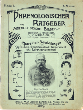 Ullrich, M. W. (Hrsg.): Phrenologischer Ratgeber und Phrenologische Bilder. Charakter=Beurteilungen nach Kopfbildung, Gesichtsausdruck, Temperament und Lebensgewohnheiten. Band 1. 1. Nummer. Verlag M. W. Ullrich, Berlino.J. (un 1904). 4°. Mit 10 Textfig. (Abb.) 16 S. illustr. OKarton.