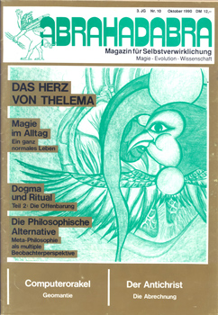 Abrahadabra. Magazin für Selbstverwirklichung. Magie – Evolution – Wissenschaft. (3. J.G., Nr. 10 Oktober 1990). Peyn und Schulze Verlag, Bergen/Dumme 1990. 4°. Mit zahlreichen Textabbildungen. 76 S. farbig illustr. OBroschur.