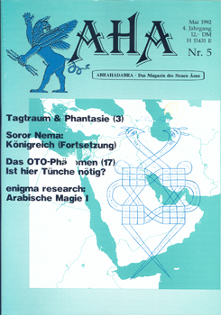 AHA. Abrahadabra – Das Magazin des Neuen Äons. (Mai 1992. 4. Jahrgang, Nr. 5). Petra Schulze Verlag, Bergen/Dumme 1992. 4°. Mit zahlreichen Textabbildungen. 75 S. farbig illustr. OBroschur.