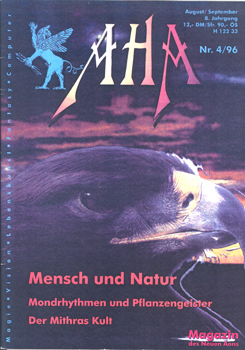 Sabrina Ulbrich (Hrsg.): AHA. Magazin des Neuen Äons. (August / September 1996. 8 Jahrgang, Nr. 4). EVOLOS Verlag Sabrina Ulbrich, Bergen/Dumme 1996. 4°. Mit zahlreichen Textabbildungen. 74 S. farbig illustr. OBroschur.