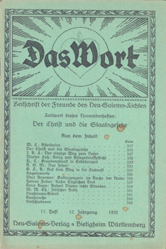 Das Wort. Zeitschrift der Freunde des Neu-Salems-Lichtes. [11. Heft, 12. Jahrgang]. Neu-Salems-Verlag, Bietigheim Württemberg [November] 1932. S. 318 [317] bis 346, 1 Bl. Vlgs.-Anz. OBroschur.
