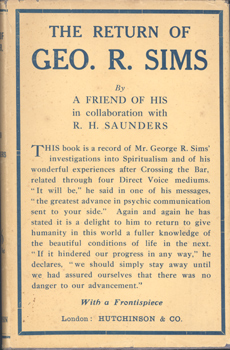 Saunders, R. H. (and a Friend): The Return of George R. Sims. Hutchinson & Co., o.O. [London] o.J. [um 1928]. (1 Frontispiece), 125 S., 1 Bl. OLwd. mit Rückengoldprägung u. OUmschlag.