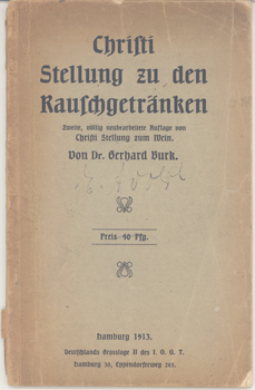 Burk, Dr. Gerhard: Christi Stellung zu den Rauschgetränken. Verlag von Deutschlands Großloge II des I.O.G.T. [Guttempler-Orden], Hamburg 1913. Zweite, völlig neu bearbeitete Auflage von Christi Stellung zum Wein. 63 S., 2 Bl. (Inhalt u. Vlgs.-Anz.) OKarton.