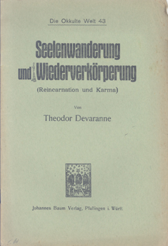 Devaranne, Theodor: Seelenwanderung und Wiederverkörperung (Reincarnation und Karma). Johannes Baum Verlag, Pfullingen i. Württ[emberg] 1921. 2.-3. Auflage. 24 S. OKarton.
