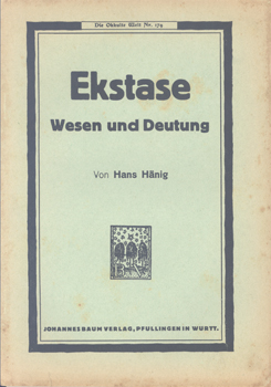Hänig, Hans: Ekstase. Wesen und Deutung. Johannes Baum Verlag, Pfullingen i. Württ[emberg] o.J. [um 1927]. 24 S., 4 Bl. Vlgs.-Anz. OKarton.