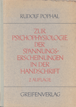 Pophal, Prof. Dr. med. Rudolf: Zur Psychophysiologie der Spannungserscheinungen in der Handschrift. Der Greifenverlag, Rudolstadt 1949. Zweite, umgearbeitete und vermehrte Auflage. Mit 2 Abbildungen, 8 Übersichtstafeln und 1 Schriftprobenheft. 137 S., 3 mehrfach gefaltete Tafeln, Beilage OHLwd.