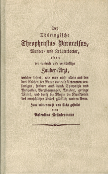 Kräutermann, Valentin: Der Thüringische Theophrastus Paracelsus, Wunder- und Kräuterdoctor oder Zauber-Arzt. Freiburg im Breisgau, Aurum Vlg. 1978. 2 Bl., 402 S., 1 Bl. Vlgs.-Anz. OKunstldr.