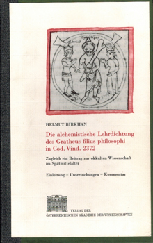 Birkhan, Helmut: Die alchemistische Lehrdichtung des Gratheus filius philosophi in Cod. Vind. 2372. Zugleich ein Beitrag zur okkulten Wissenschaften im Spätmittelalter. (in zwei Bänden]. Verlag der Österreichischen Akademie der Wissenschaften, Wien 1992. Gr.-8°. Mit zahlreichen Abbildungen im Text und auf Tafeln. 494 S., 1 (w), 1 Bl. (Errata); 338 S., 2 Bl. (Errata u. Abbildungsnachweis), 4 Bl. (Tafeln) priv. HLwd. Bde. m. aufgez. OKarton.