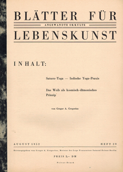 Blätter für angewandte okkulte Lebenskunst. August 1952 – Heft 29. Herausgegeben (als Privatdruck) von Gregor A. Gregorius. Meister der Loge Fraternitas Saturni Orient Berlin, Berlin 1952. 4°. 1 Bl. (Deckblatt m. Titel), 14 Bl. Typoskriptdruck mit Klammerheftung und Fälzelstreifen.