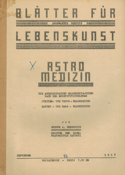 Gregor A. Gregorius (Hrsg.) [d.i.: Otto Max Eugen Grosche]: Blätter für angewandte okkulte Lebenskunst. September 1953 – [Heft 42]. Herausgegeben (als Privatdruck) von Gregor A. Gregorius. Meister der Loge Fraternitas Saturni Orient Berlin, Berlin 1953. 4°. 1 Bl. (Deckblatt m. Titel), 24 S. Typoskriptdruck mit Klammerheftung und Fälzelstreifen.