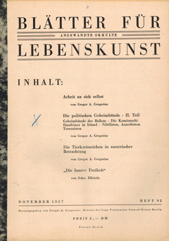 Gregor A. Gregorius (Hrsg.) [d.i.: Otto Max Eugen Grosche]: Blätter für angewandte okkulte Lebenskunst. November 1957 – [Heft 92]. Herausgegeben (als Privatdruck) von Gregor A. Gregorius. Meister der Loge Fraternitas Saturni Orient Berlin, Berlin 1957. 4°. 1 Bl. (Deckblatt m. Titel), 21 S. Typoskriptdruck mit Klammerheftung und Fälzelstreifen.