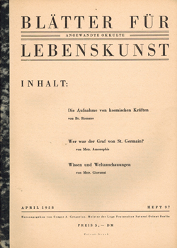 Gregor A. Gregorius (Hrsg.) [d.i.: Otto Max Eugen Grosche]: Blätter für angewandte okkulte Lebenskunst. April 1958 – [Heft 97]. Herausgegeben (als Privatdruck) von Gregor A. Gregorius. Meister der Loge Fraternitas Saturni Orient Berlin, Berlin 1958. 4°. 1 Bl. (Deckblatt m. Titel), 18 S. Typoskriptdruck mit Klammerheftung und Fälzelstreifen.