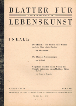 Gregor A. Gregorius (Hrsg.) [d.i.: Otto Max Eugen Grosche]: Blätter für angewandte okkulte Lebenskunst. August 1958 – [Heft 101]. Herausgegeben (als Privatdruck) von Gregor A. Gregorius. Meister der Loge Fraternitas Saturni Orient Berlin, Berlin 1958. 4°. 1 Bl. (Deckblatt m. Titel), 16 S. Typoskriptdruck mit Klammerheftung und Fälzelstreifen.