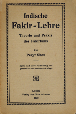 Shou, Peryt (Ps.) = Albert Christian Georg Schultz: Indische Fakir-Lehre. Theorie und Praxis des Fakirtums. Verlag Max Altmann, Lipzig 1920. Dritte und vierte vollständig umgearbeitete und vermehrte Auflage. 80 S. OKarton.
