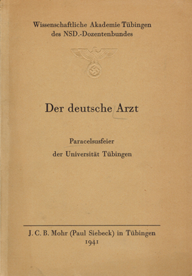 Wissenschaftliche Akademie Tübingen des NSD.-Dozentenbundes (Hrsg.): Der deutsche Arzt. Paracelsusfeier der Universität Tübingen. Verlag von J.C.B. Mohr (Paul Siebeck), Tübingen 1941. 44 S. OKarton.