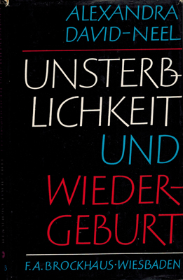 David-Néel, Alexandra: Unsterblichkeit und Wiedergeburt. Lehren und Bräuche in China, Tibet und Indien. F.A. Brockhaus, Wiesbaden 1962. Übersetzung aus dem Französischen von Dr. Fritz Montfort. 125 S., 1 Bl. Vlgs.-Anz. OLwd. mit Goldprägung und OUmschlag.